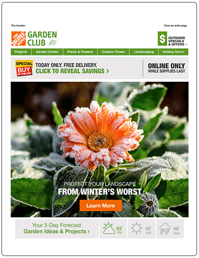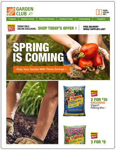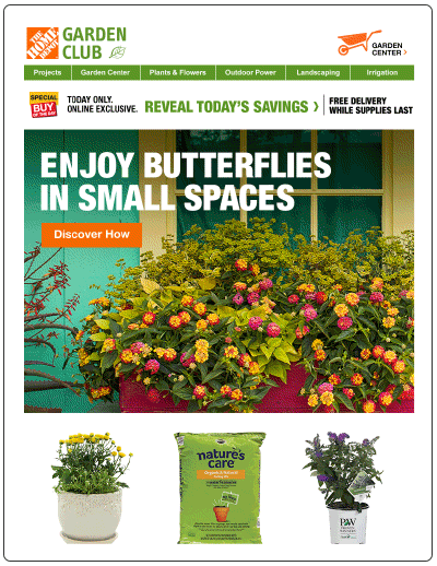 As a CRM designer at Home Depot I have been responsible for design and execution of emails for the “GardenClub” and “Pro” Lines of Business.